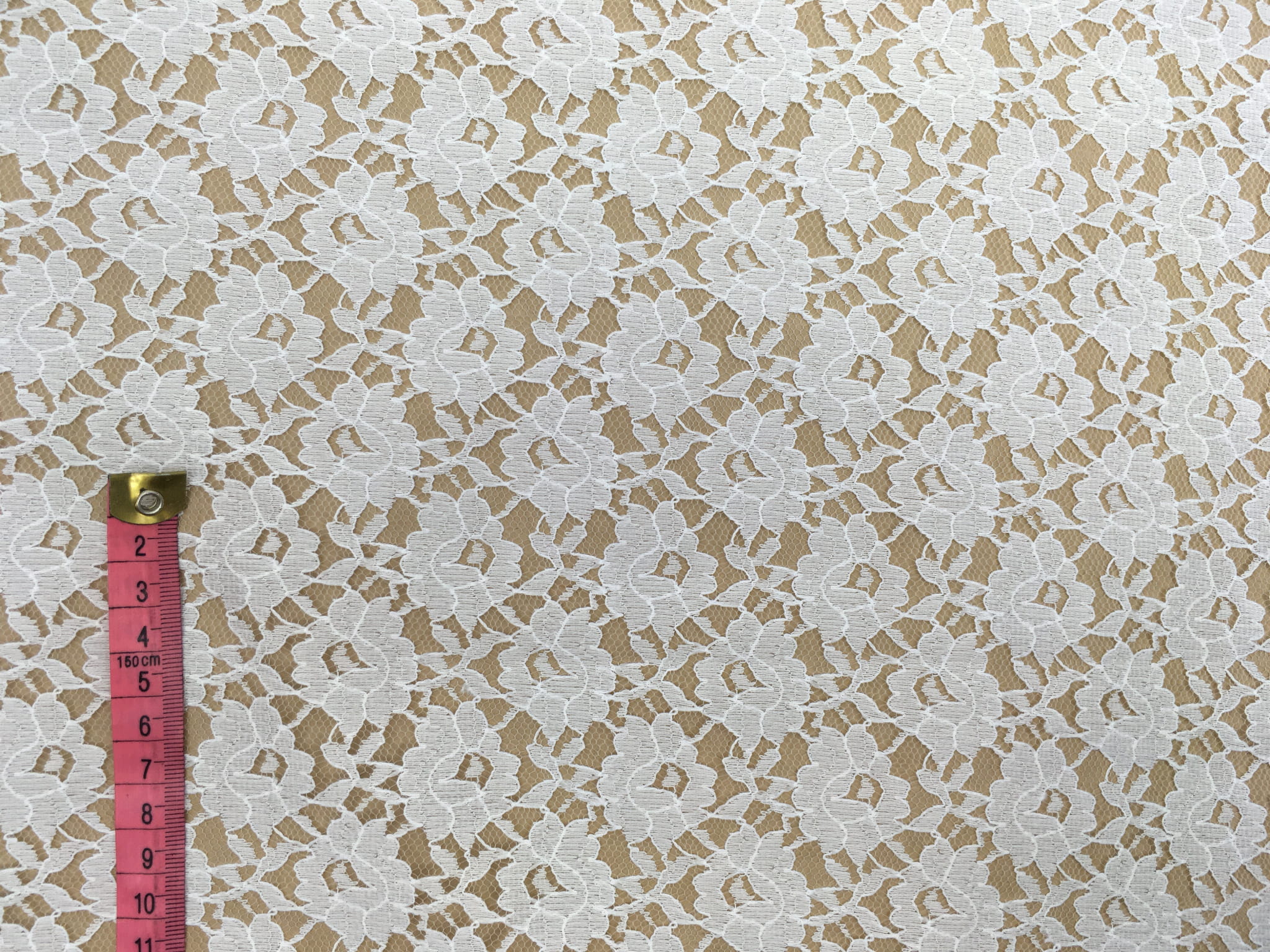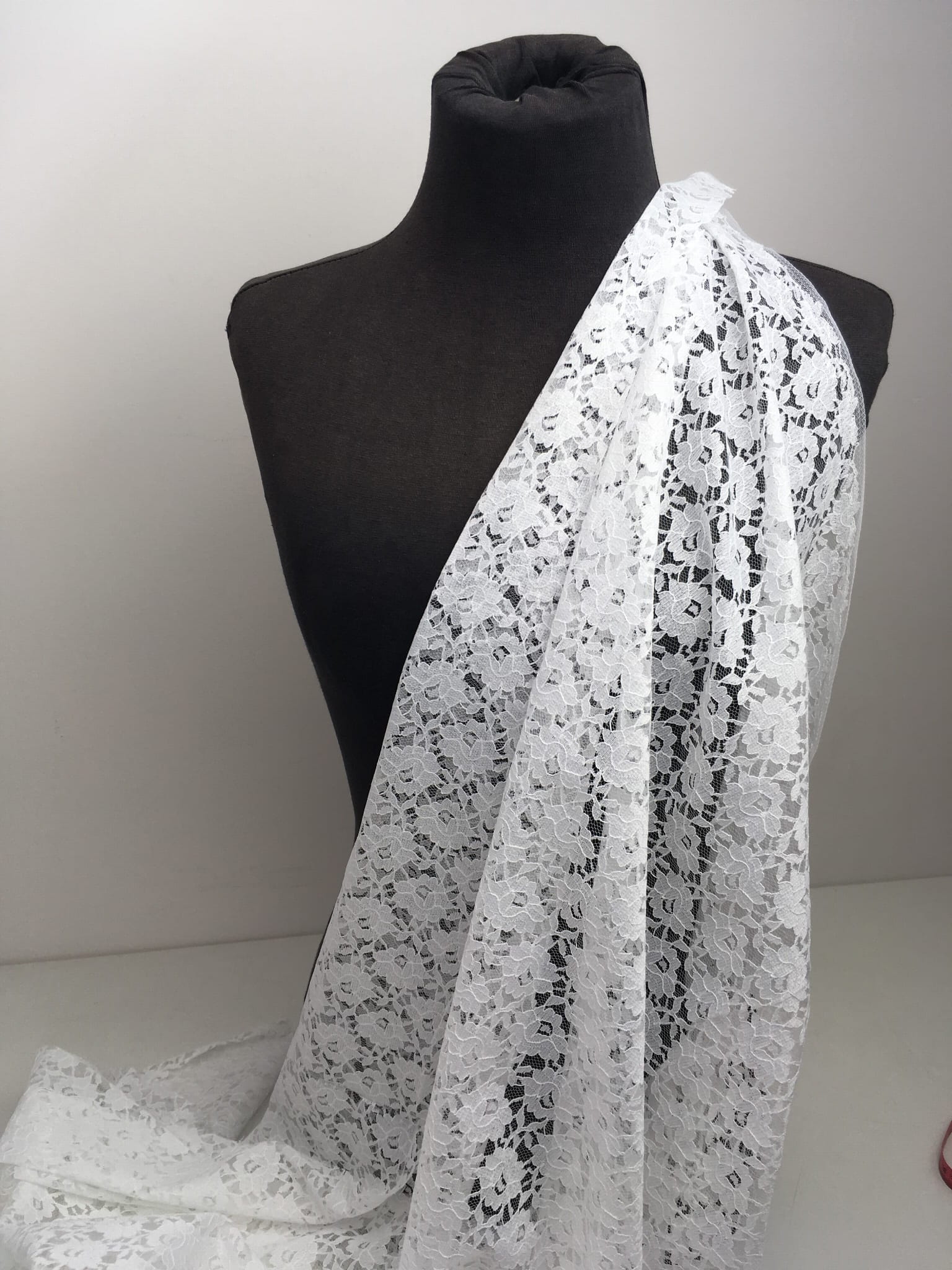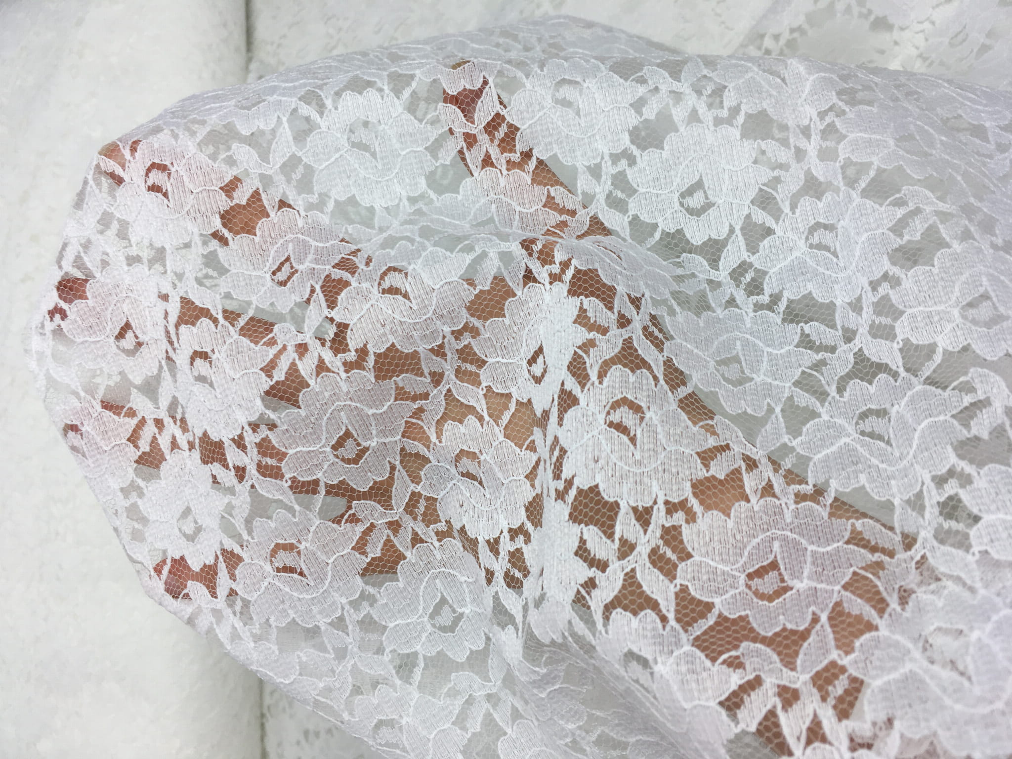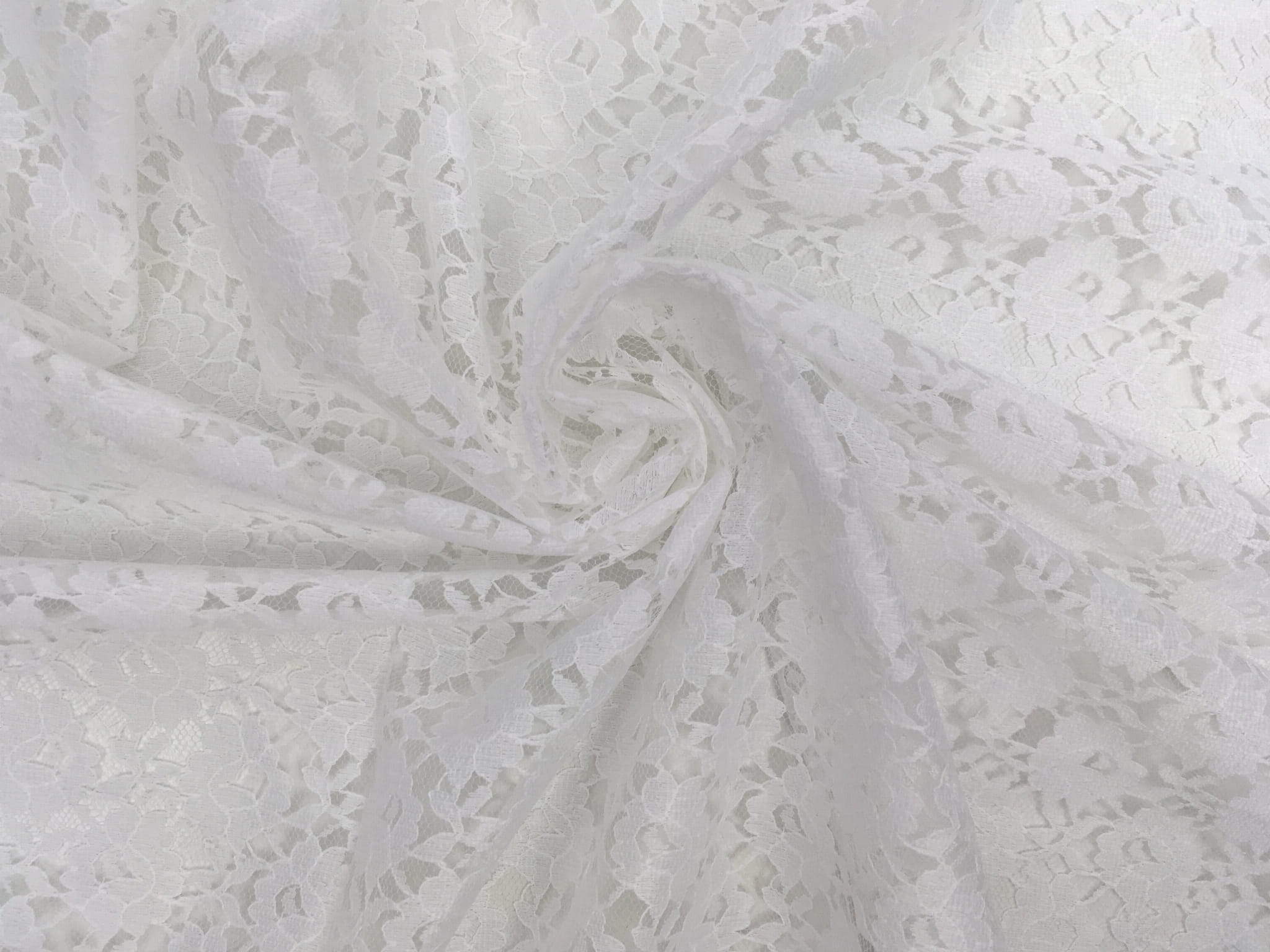 Gęsta i mało prześwitująca koronka z kwiecistym motywem. Sprawdzi się jako element dekoracji, na sukienki, bluzki, spódnice, suknie i akcesoria ślubne (np. welony, rękawiczki).