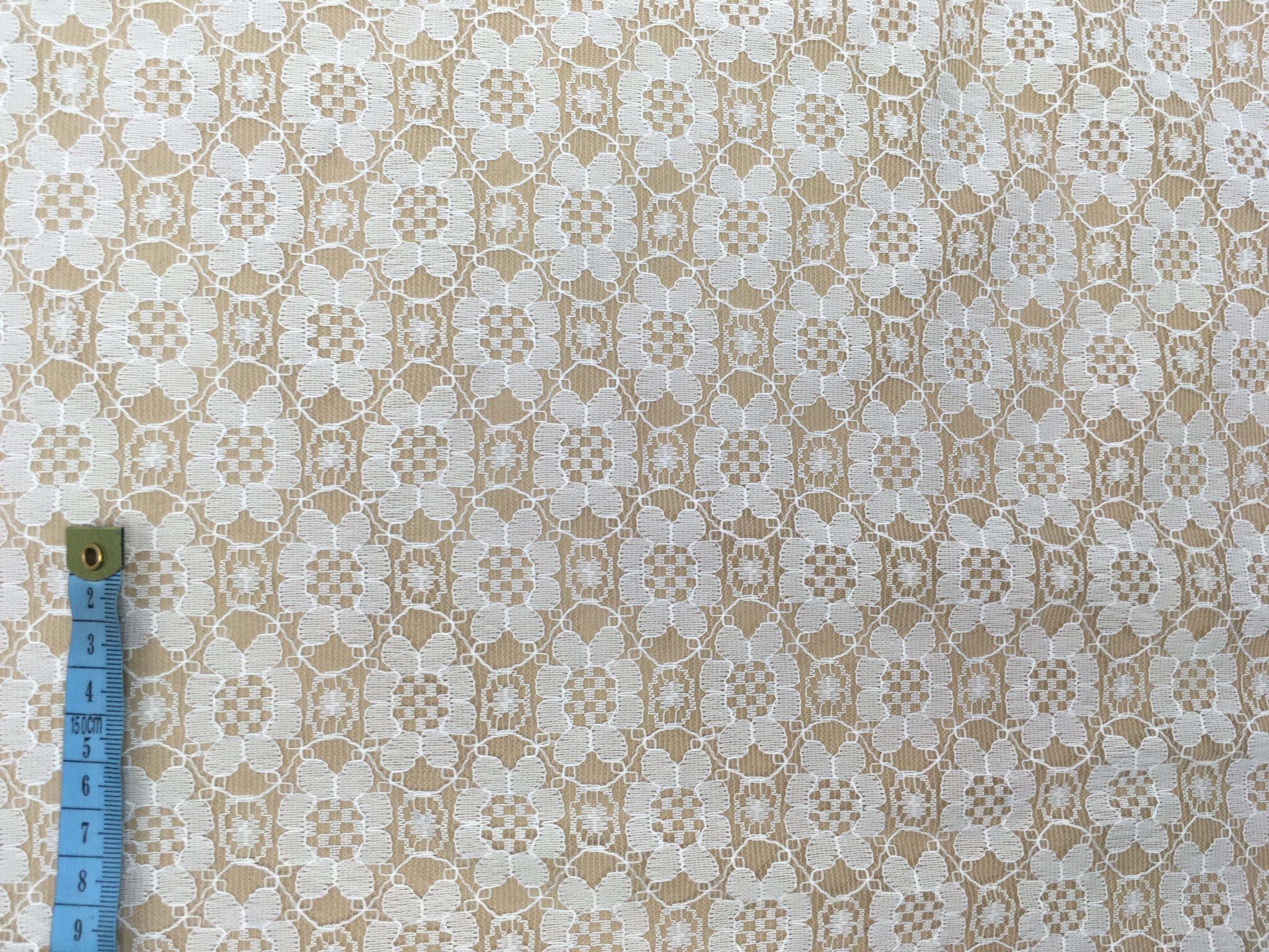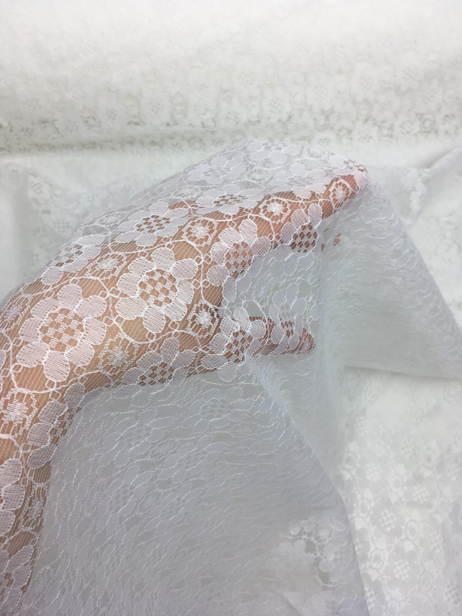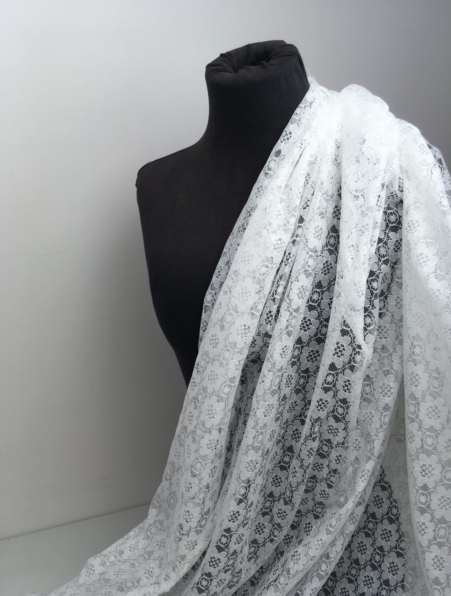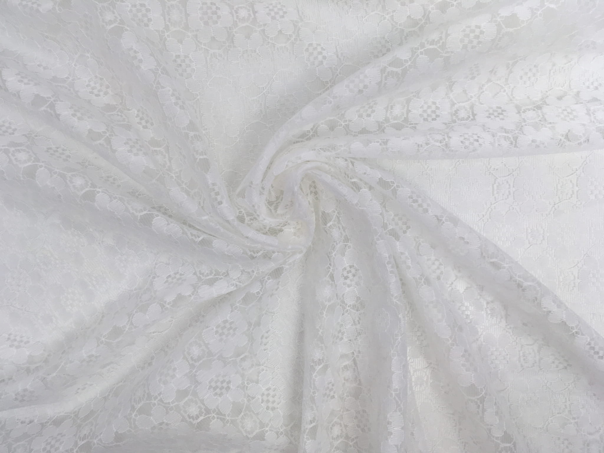 Delikatna koronka na tiulu z kwiecistym motywem. Sprawdzi się jako element dekoracji, na sukienki, bluzki, spódnice, suknie i akcesoria ślubne (np. welony, rękawiczki).
