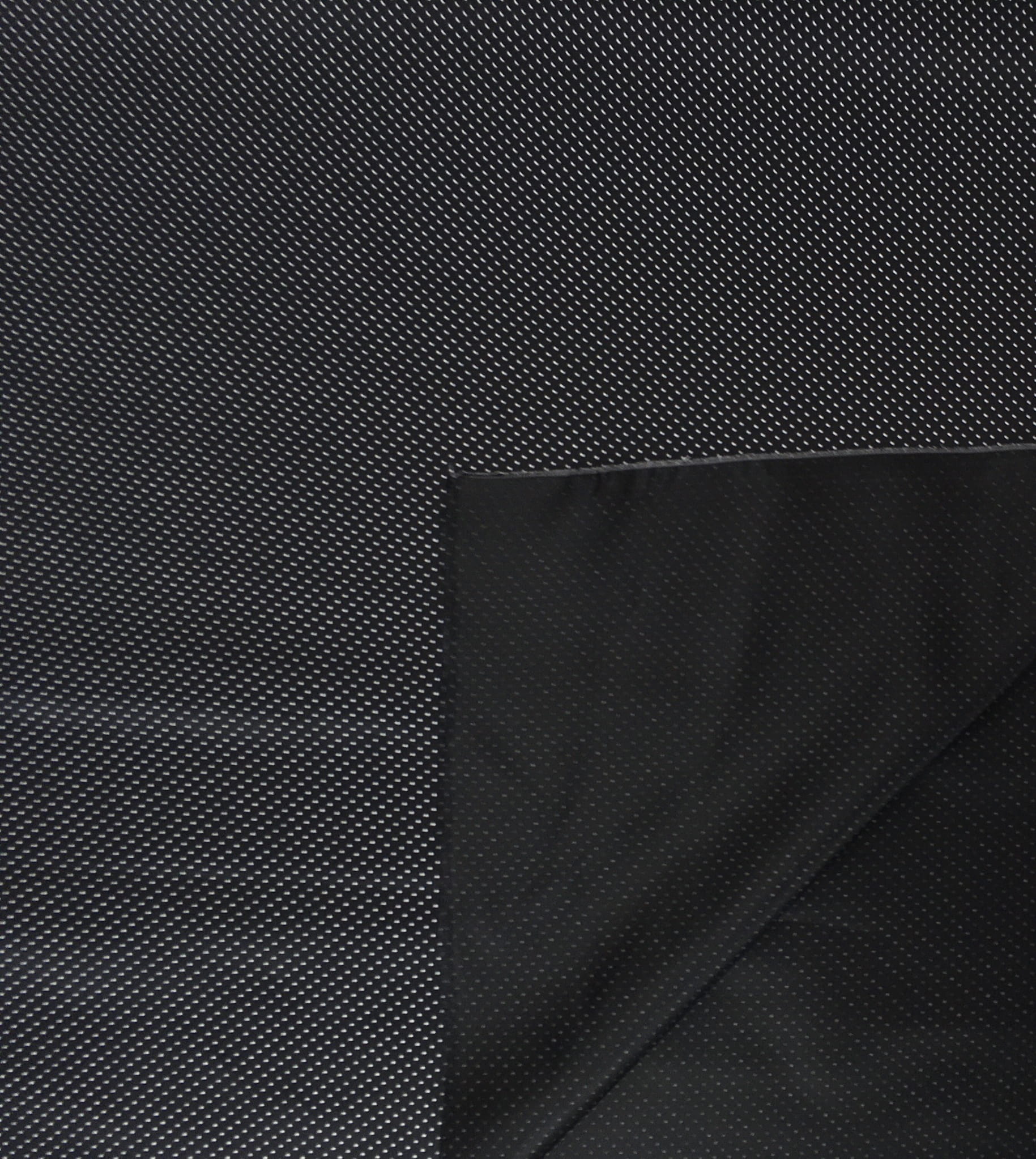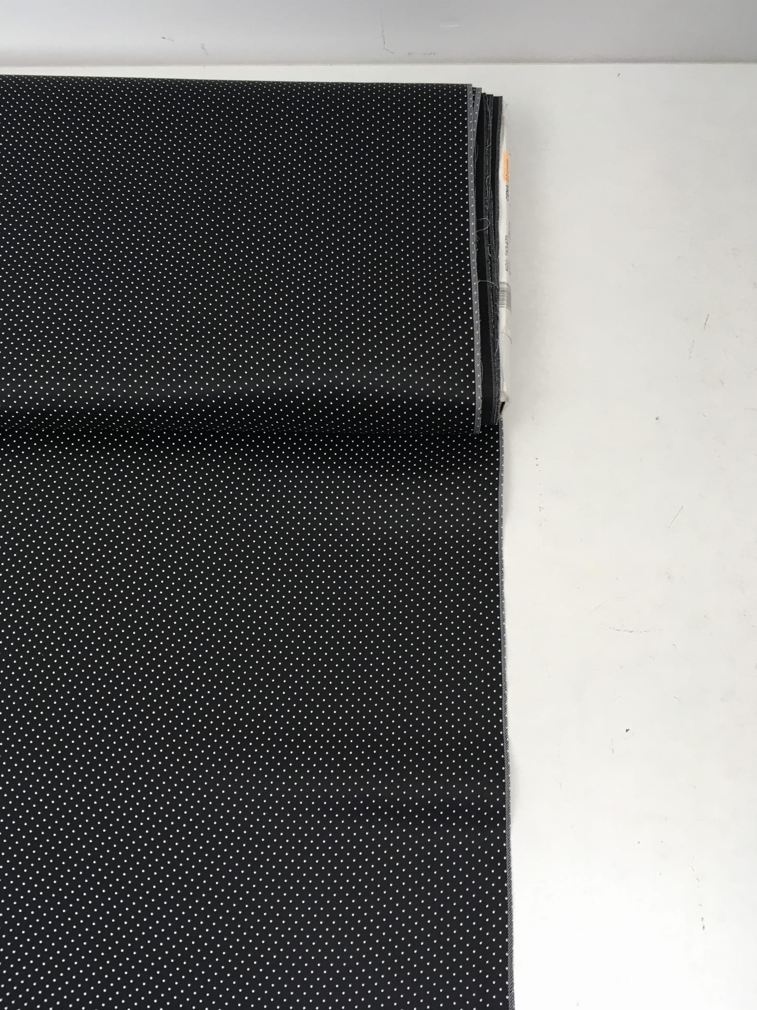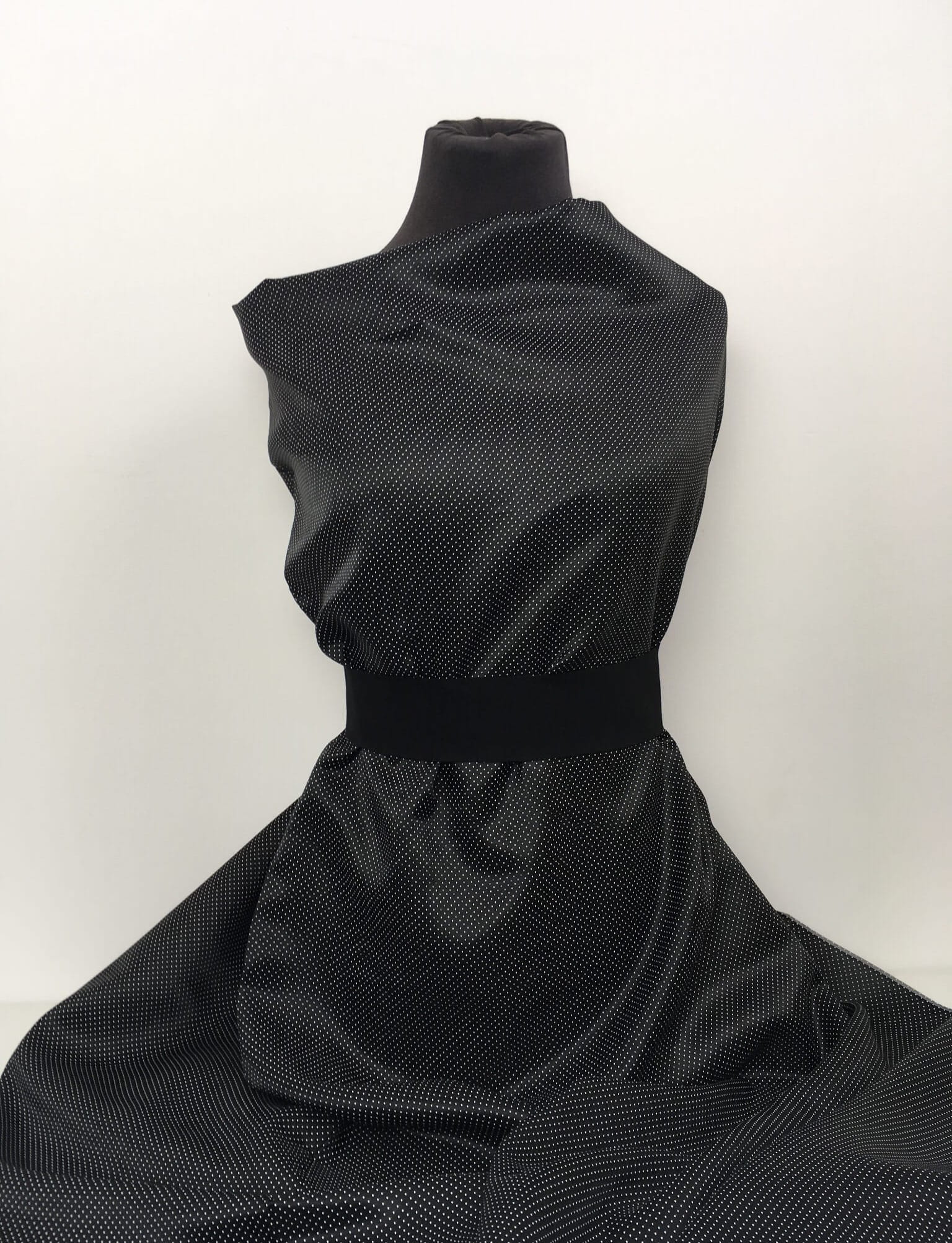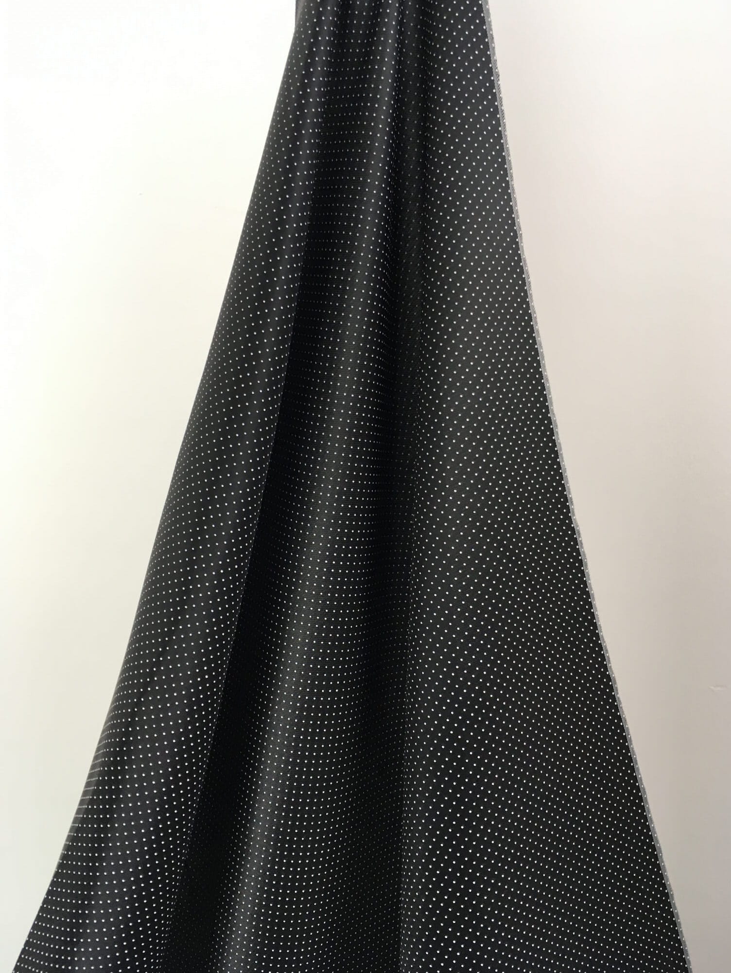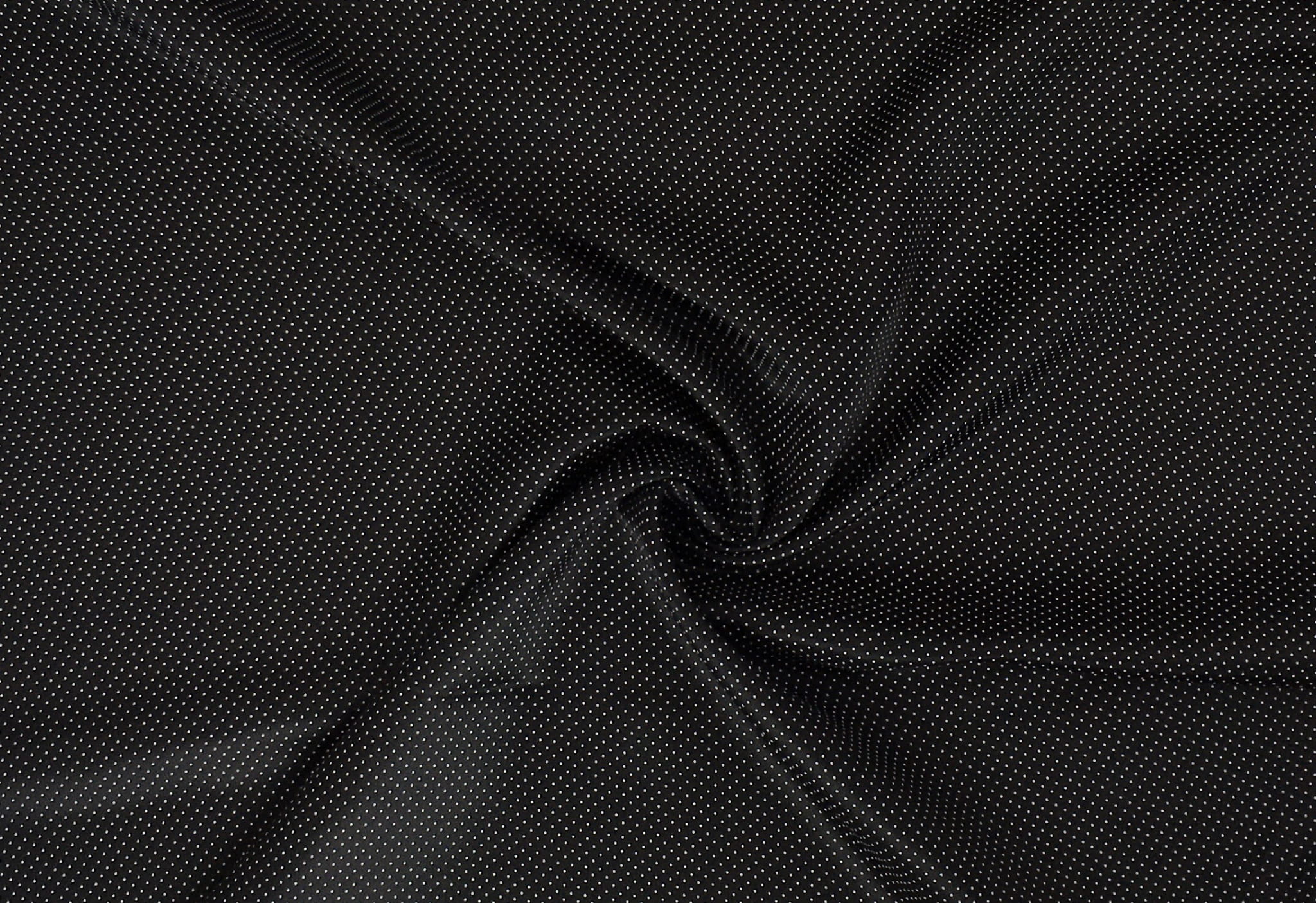 Połyskująca tkanina podszewkowa. Czarna w drobne białe kropeczki. Przyjemna w dotyku, podatna na układanie.
