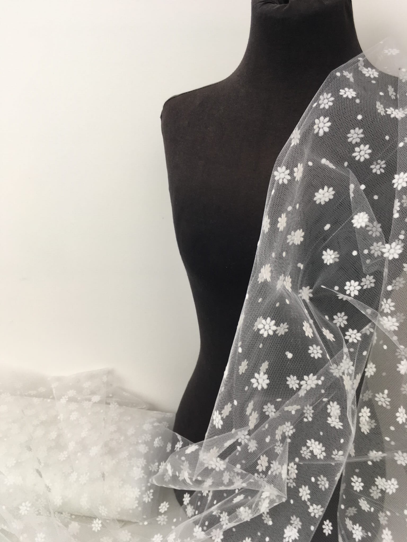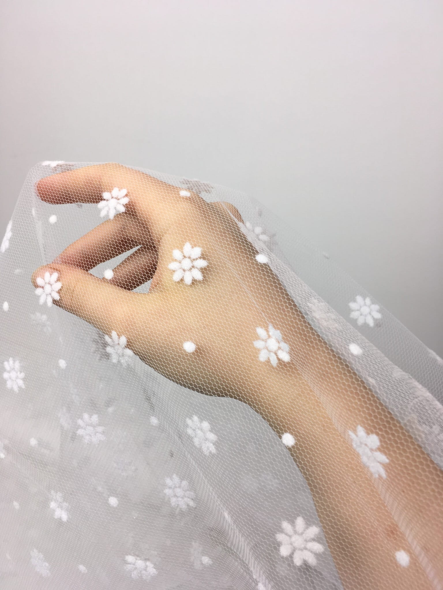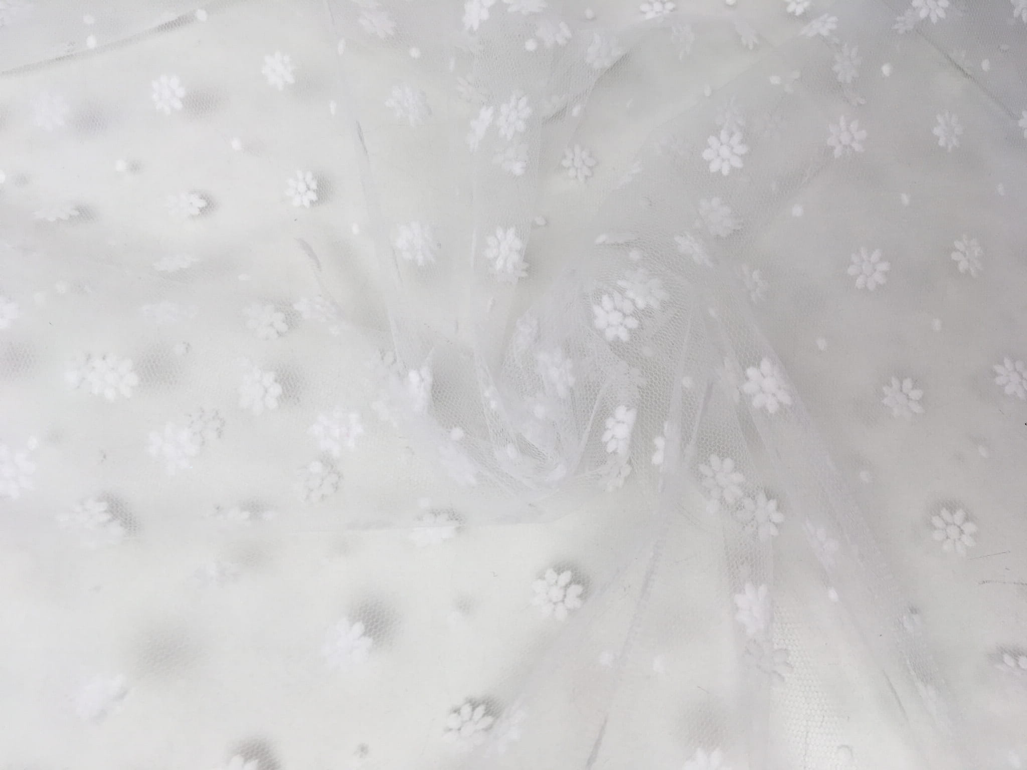 Delikatny tiul flokoway z kwiecistym motywem. Sprawdzi się jako element dekoracji, na sukienki, bluzki, spódnice, suknie i akcesoria ślubne (np. welony, rękawiczki).