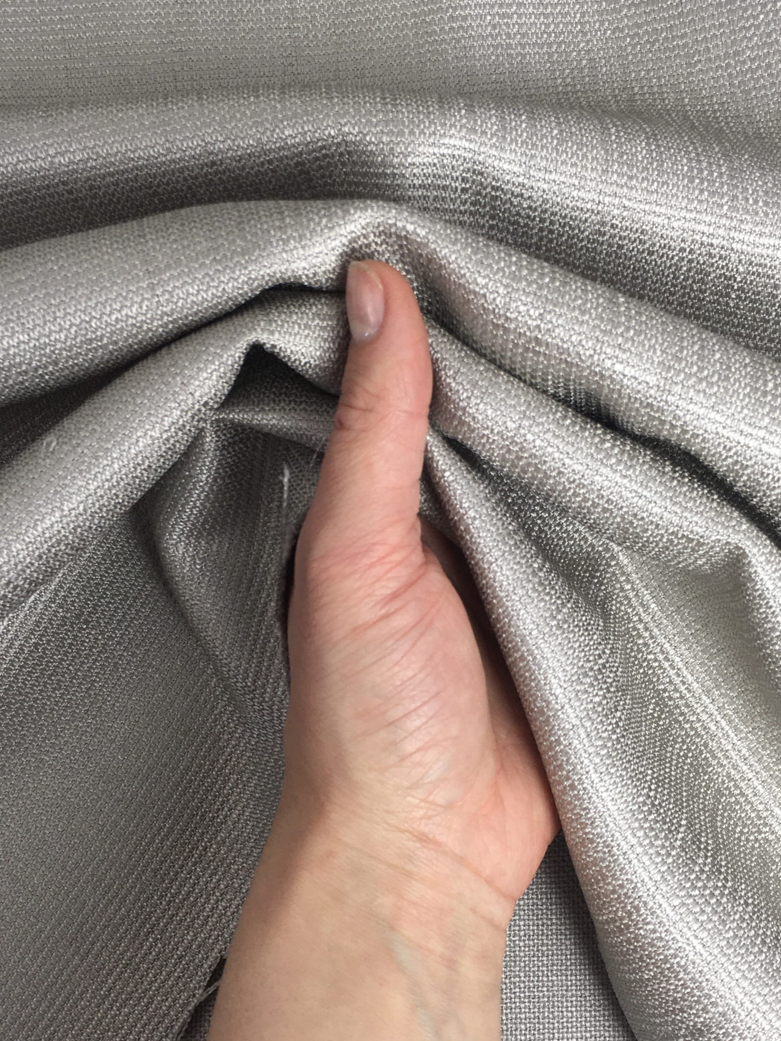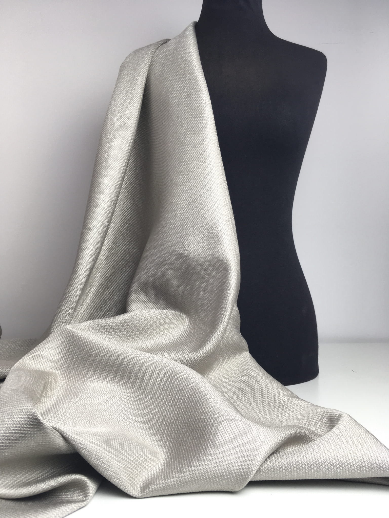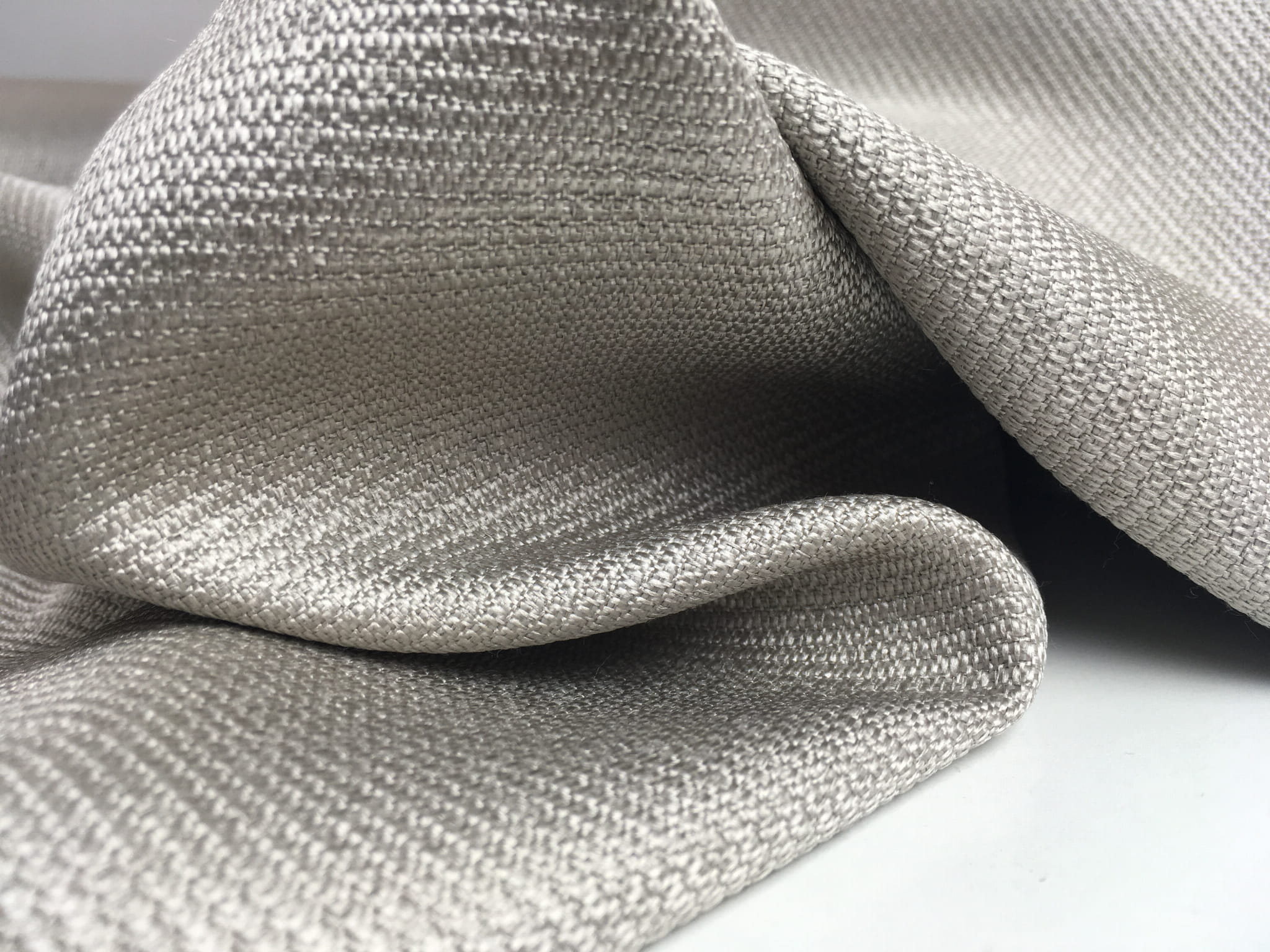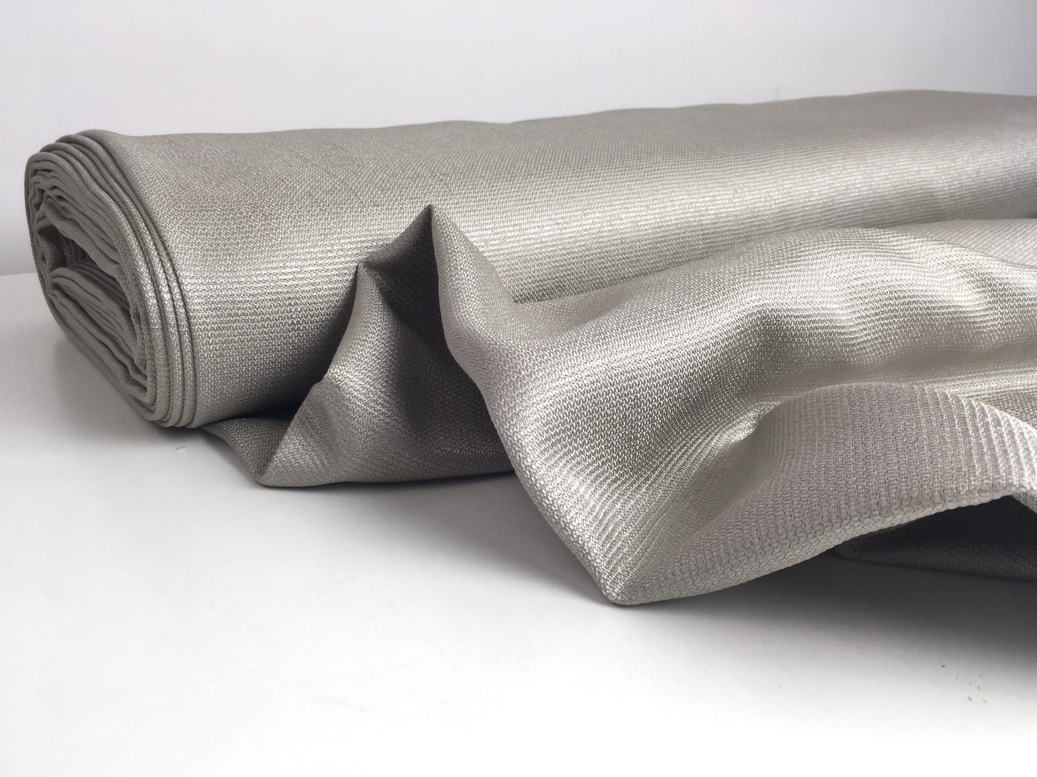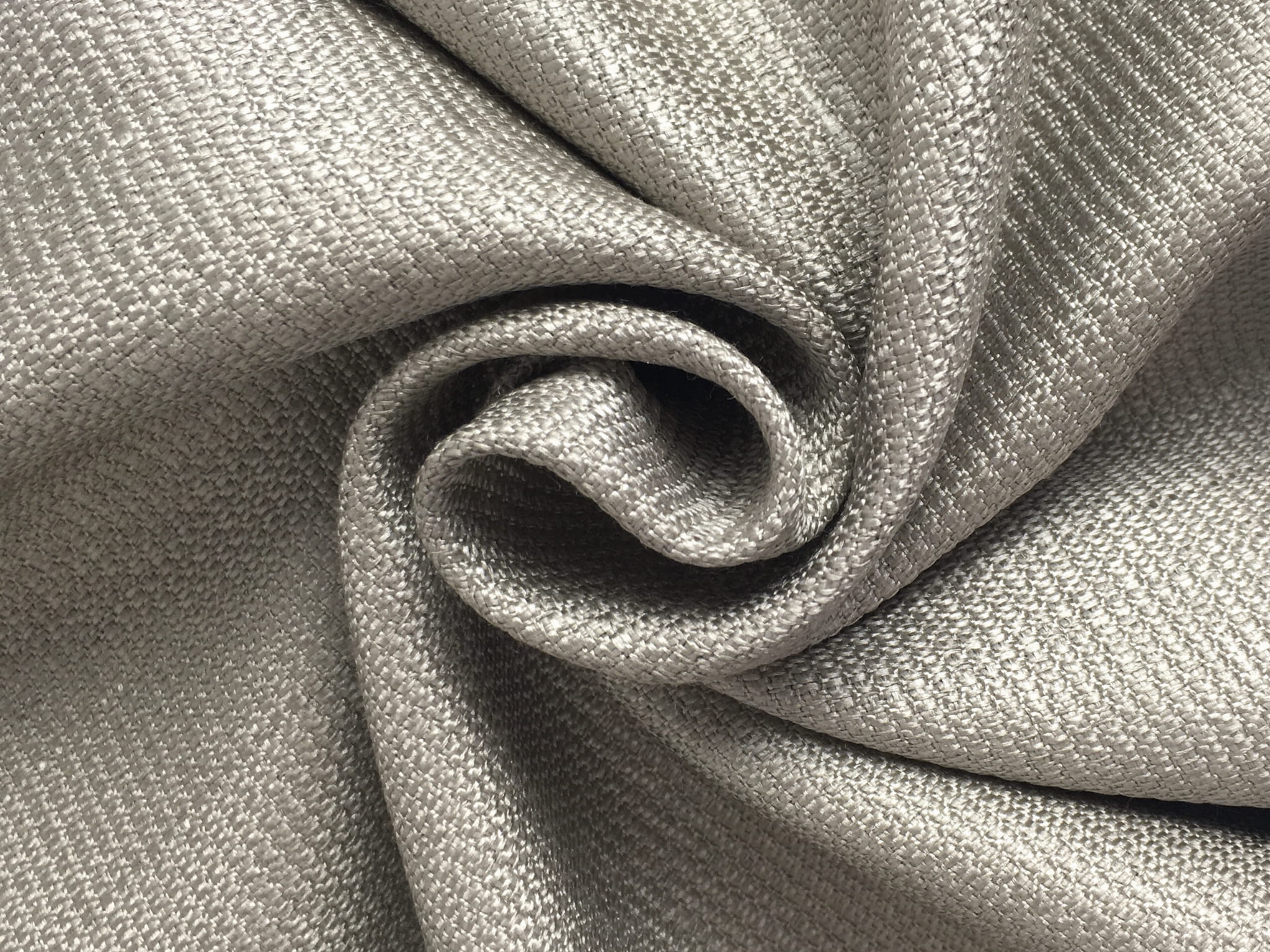 Tkanina obiciowo-dekoracyjna o grubszym splocie. Materiał ładnie pracuje, układa się miękko, współpracuje ze światłem. Kolor od ciepłej szarości, srebro po beż. Jest zakończony delikatnym połyskiem. Zastosowanie: zasłony, dekoracyjne poduchy, obicia krzeseł.