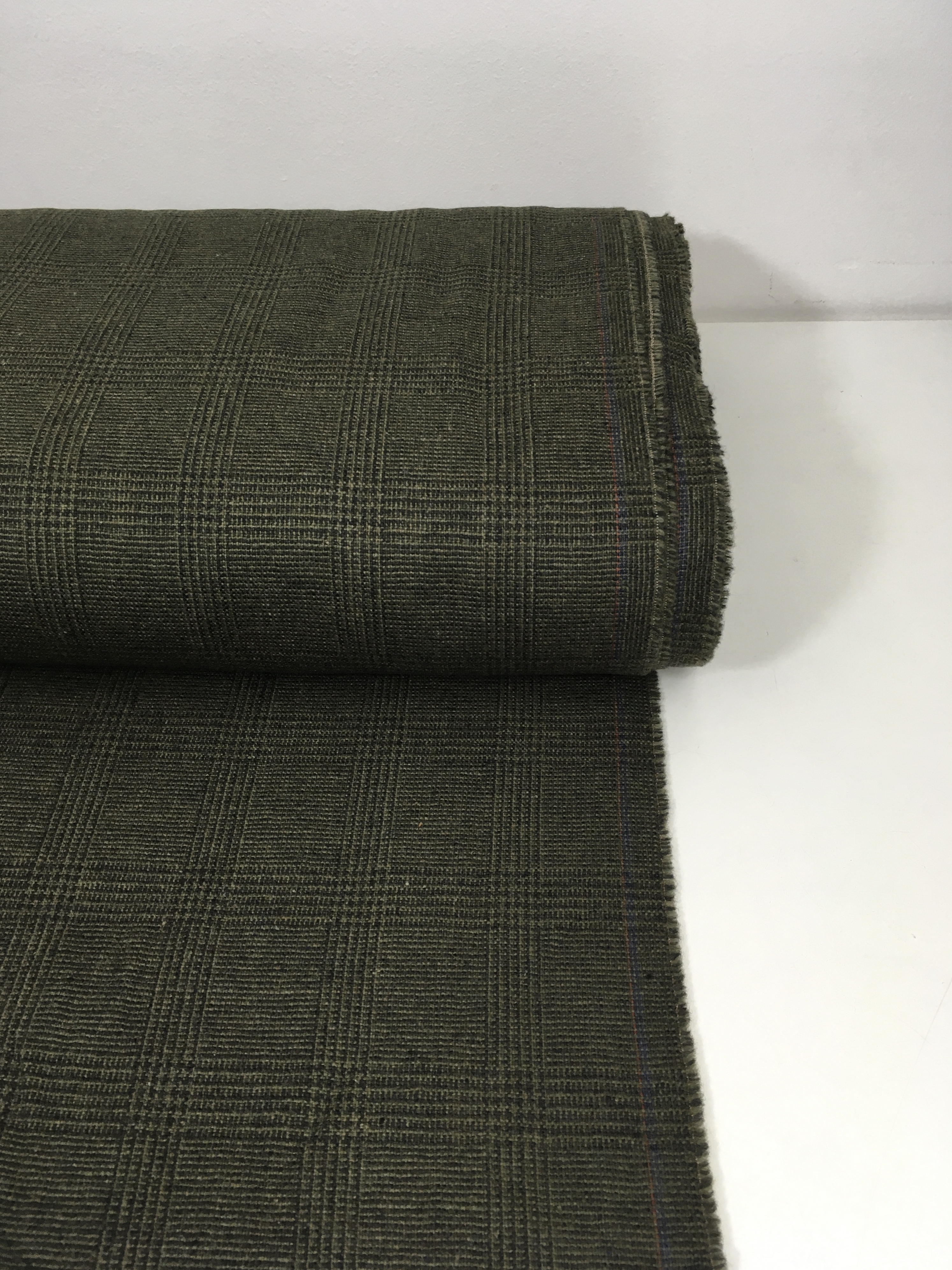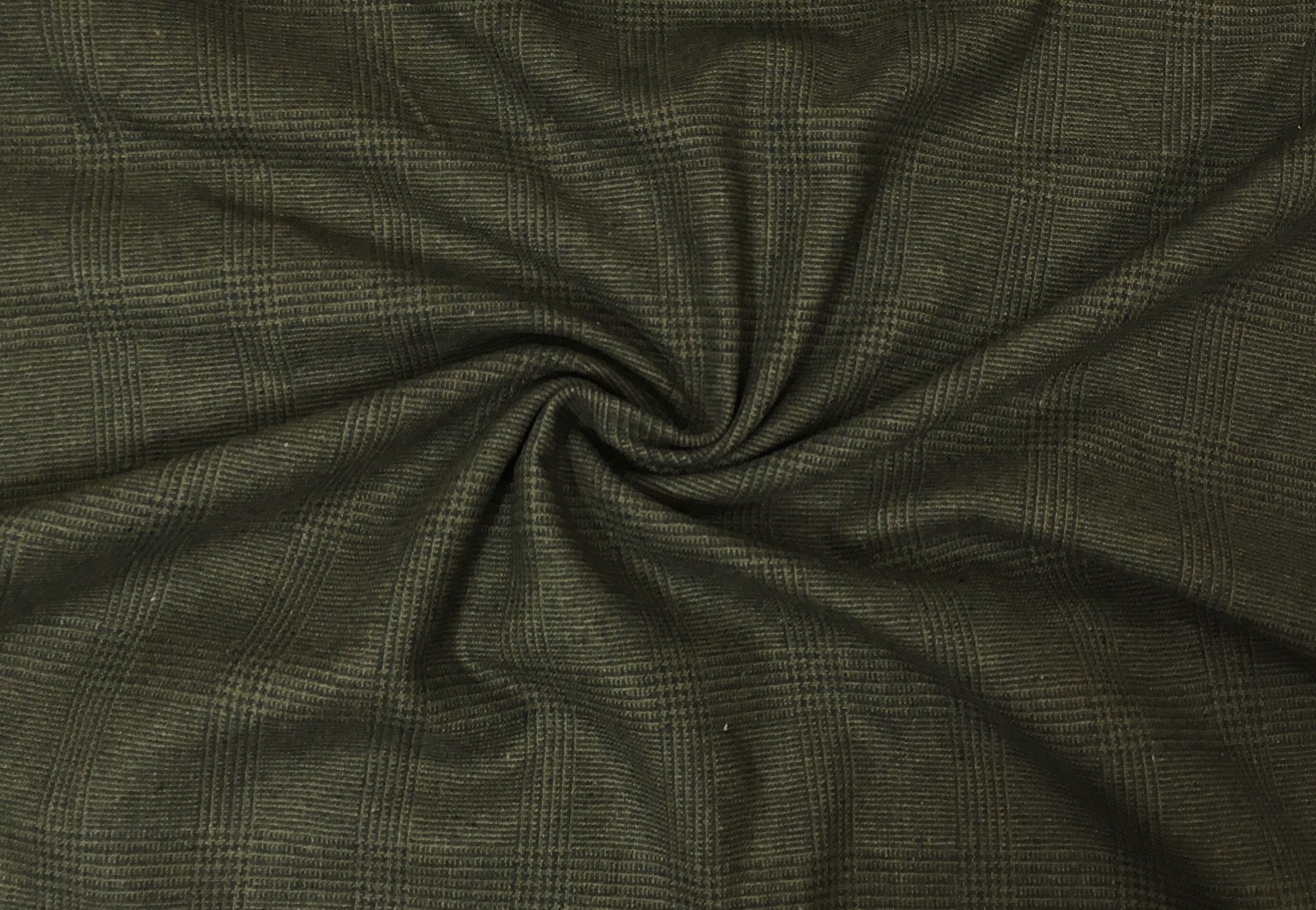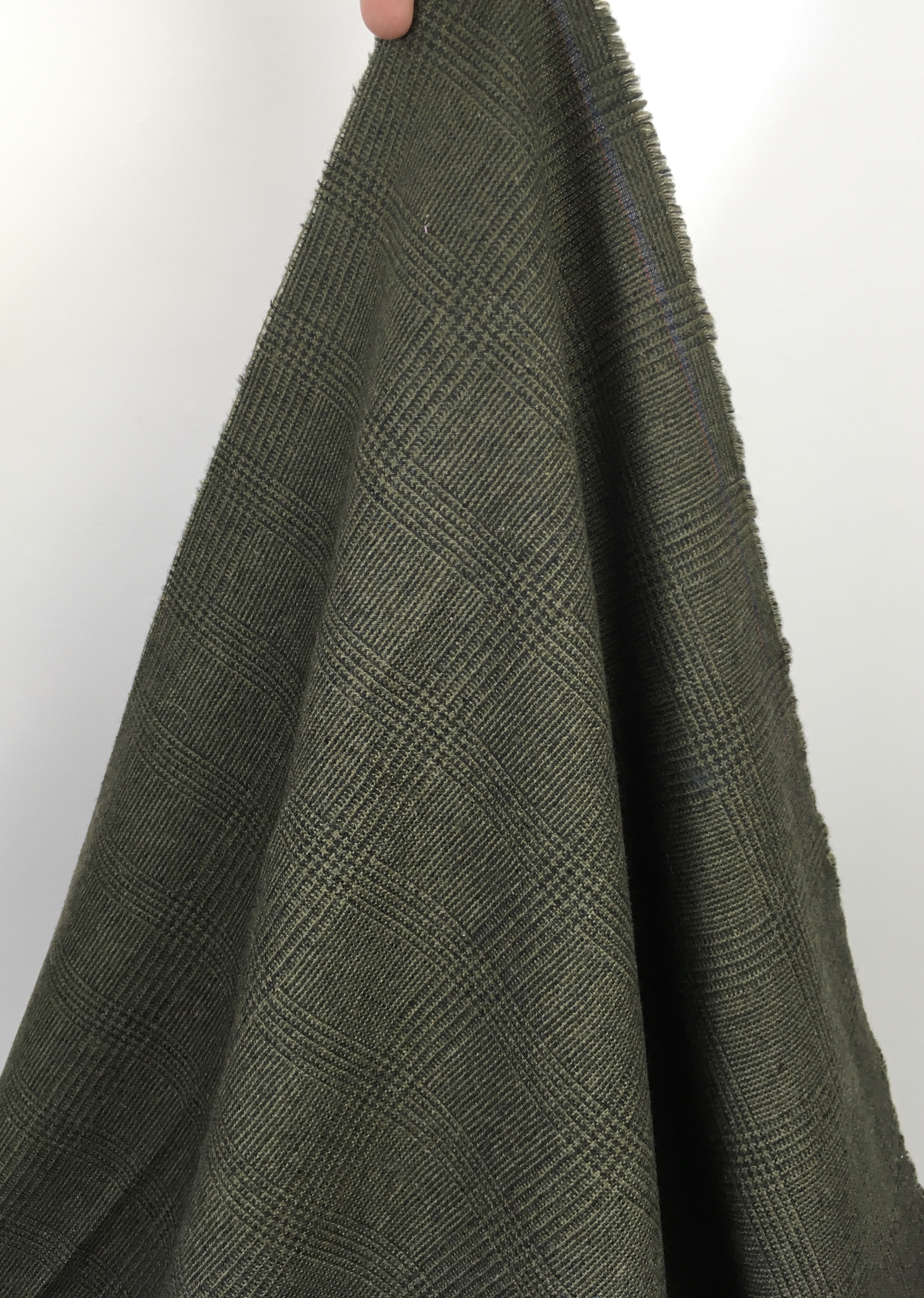 Wełniany materiał ubraniowy. Tkanina w zgaszonych zieleni z ciemniejszą kratą. Układa się miękko, lekko. Zastosowanie: żakiety, spódnice, marynarki, spodnie, sukienki.