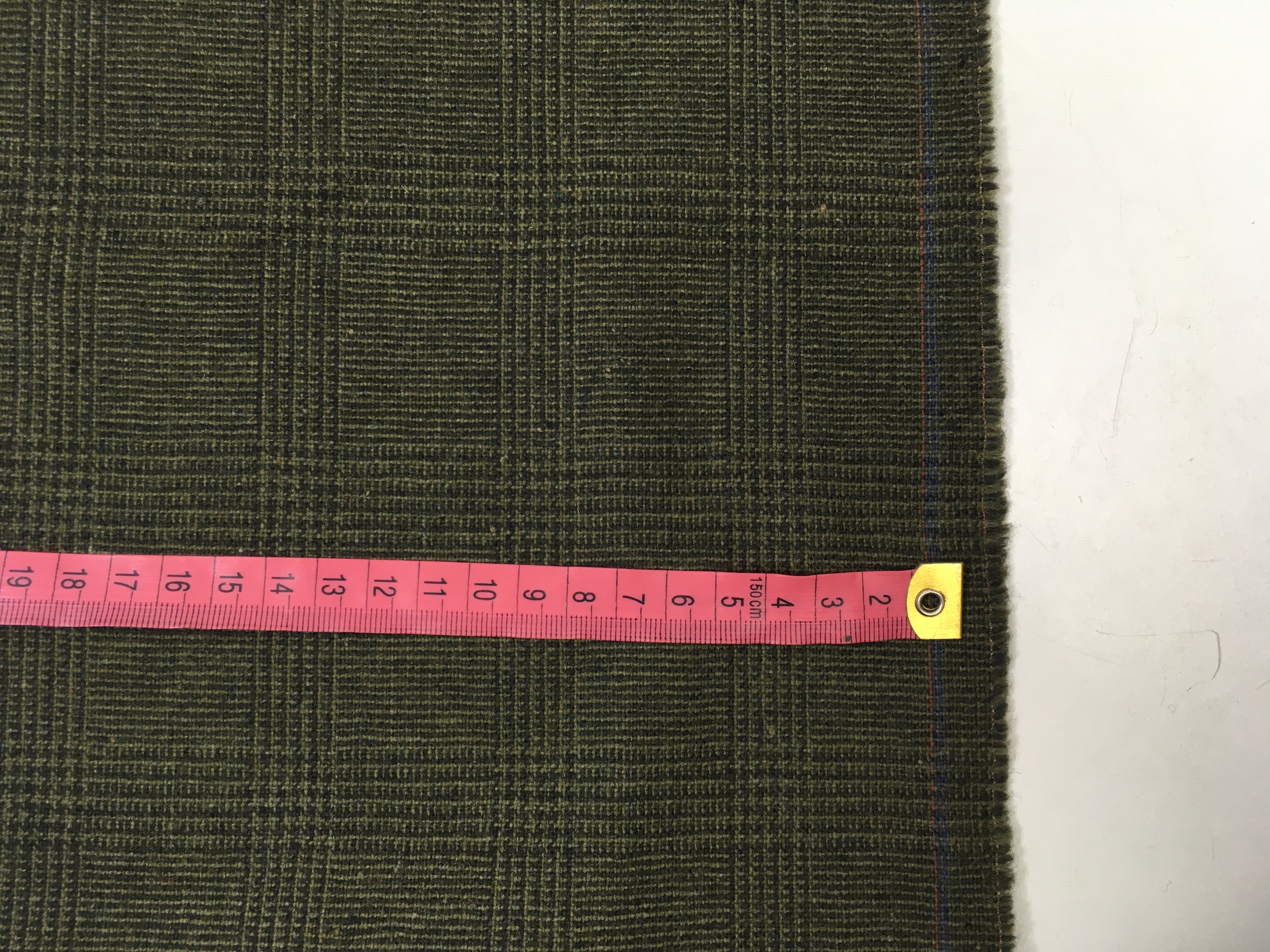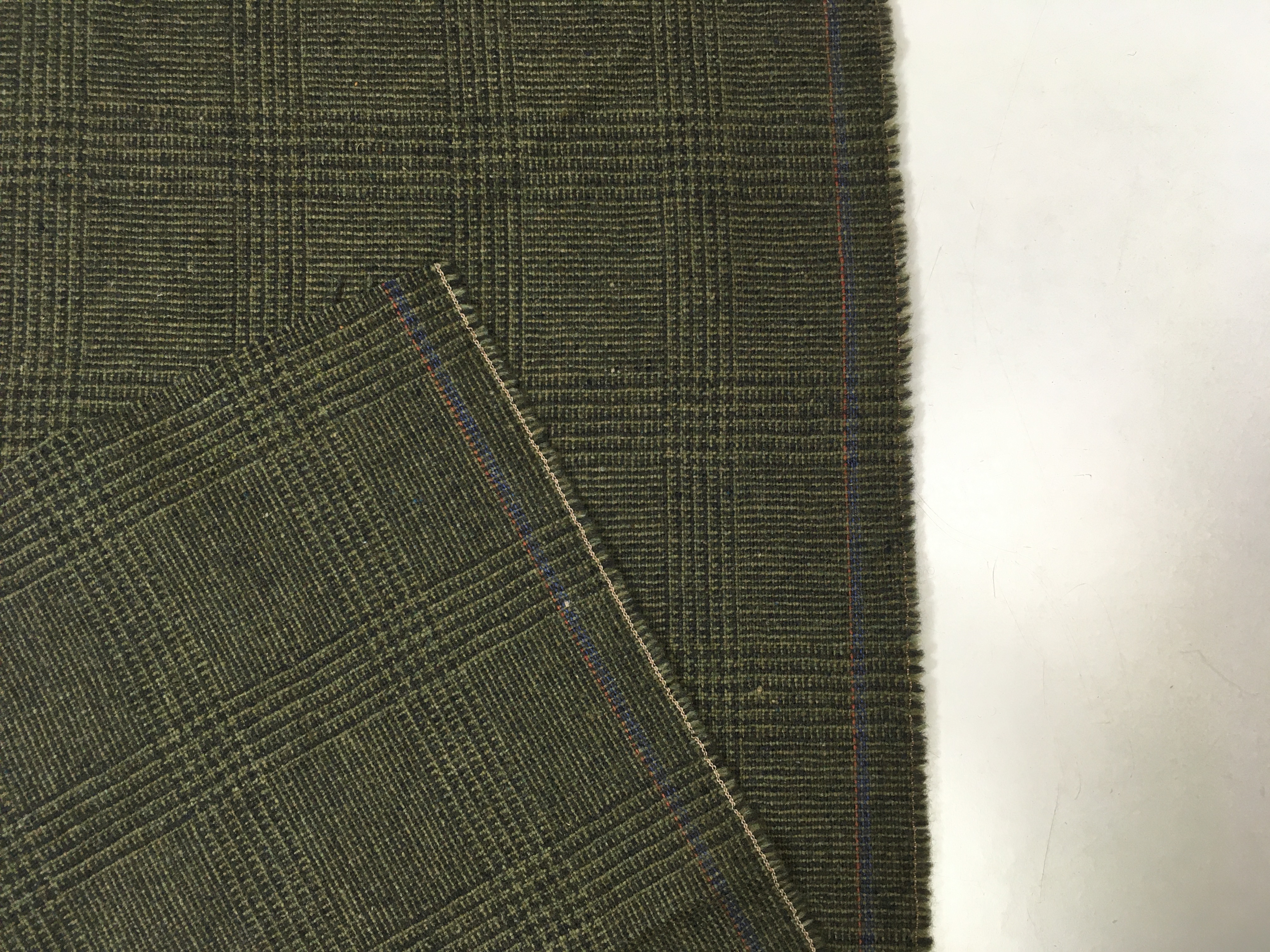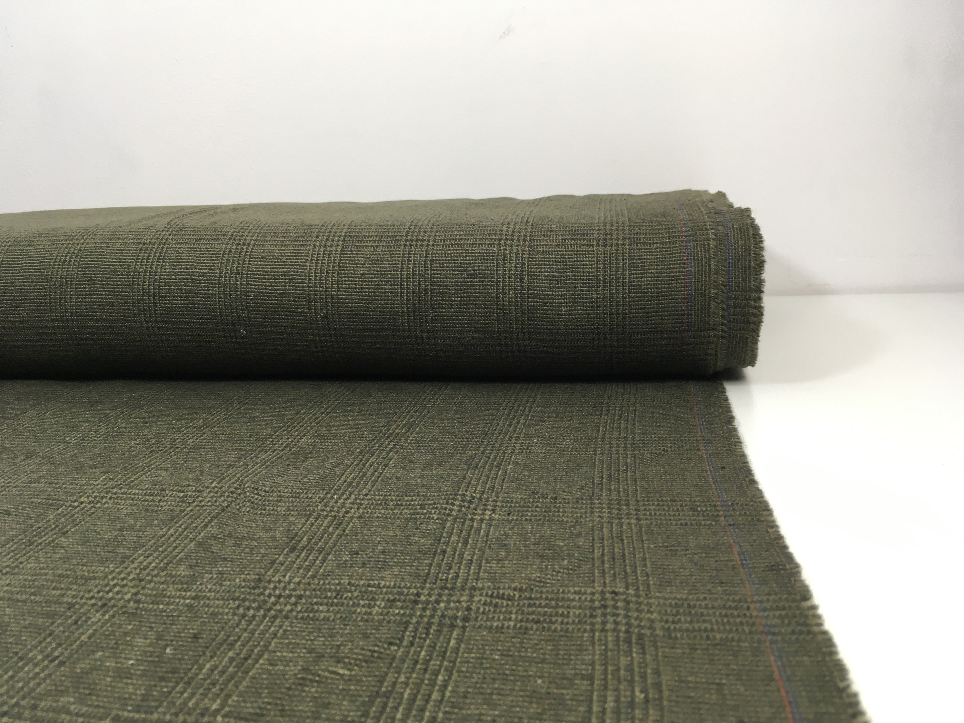 Wełniany materiał ubraniowy. Tkanina w zgaszonych zieleni z ciemniejszą kratą. Układa się miękko, lekko. Zastosowanie: żakiety, spódnice, marynarki, spodnie, sukienki.